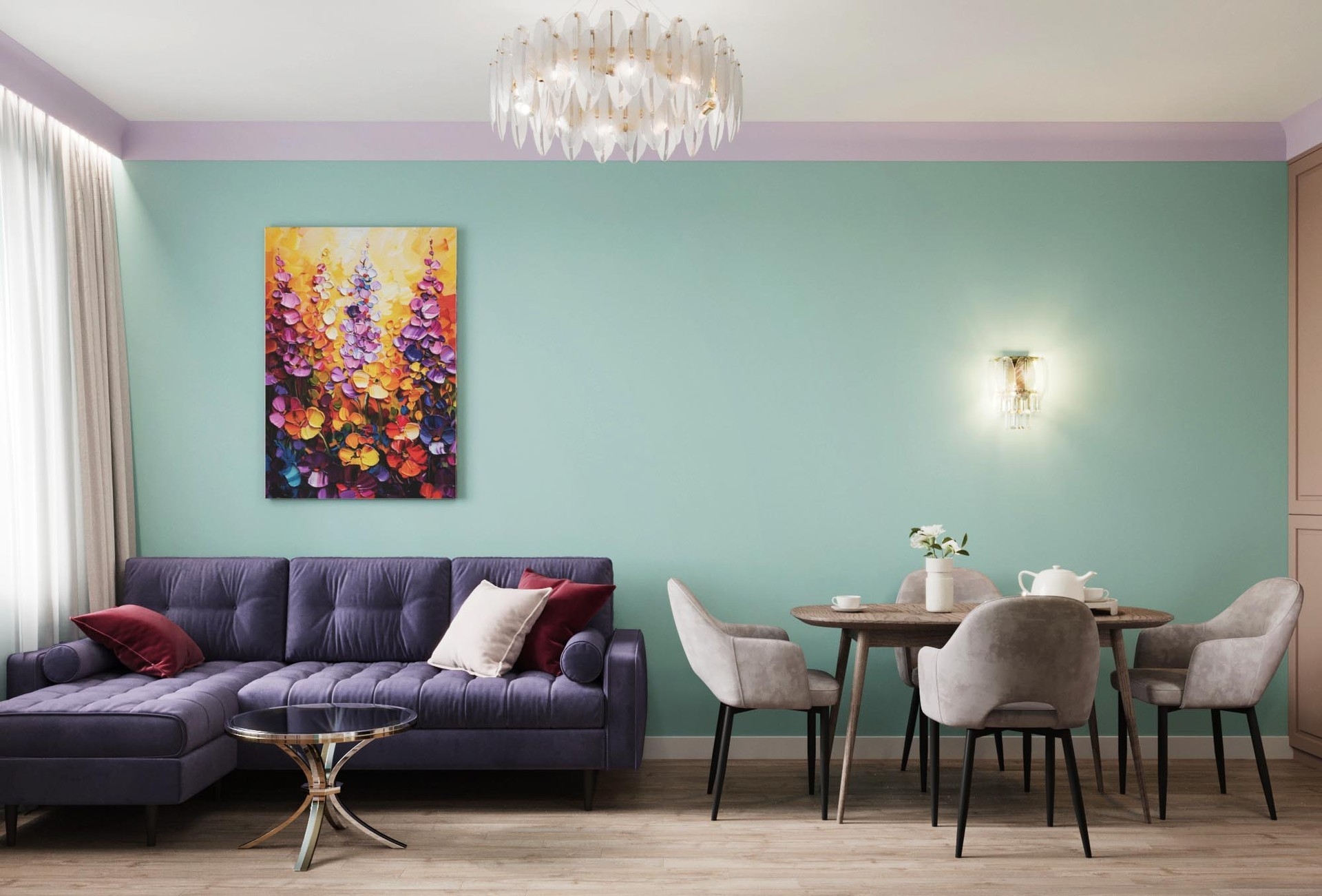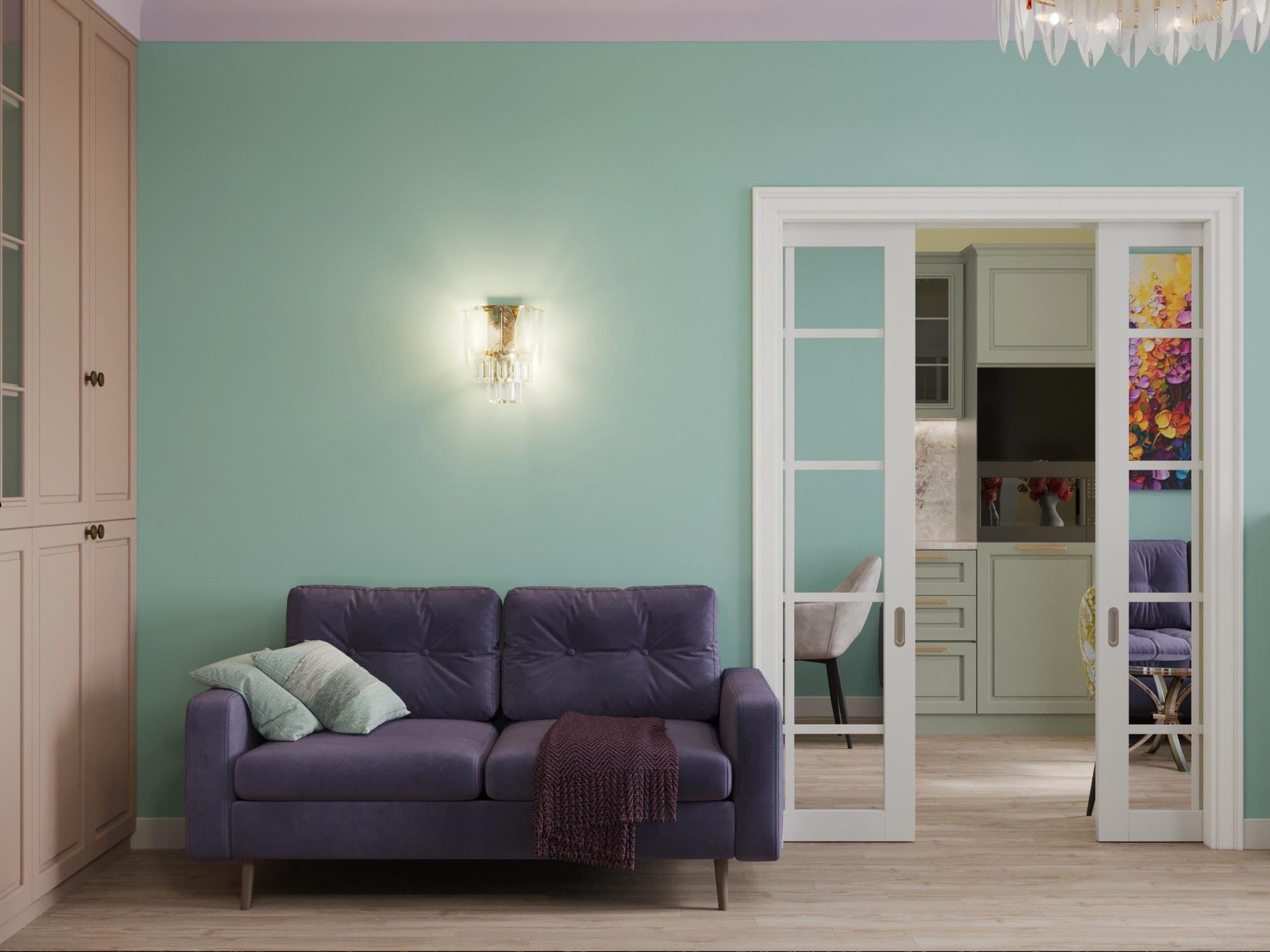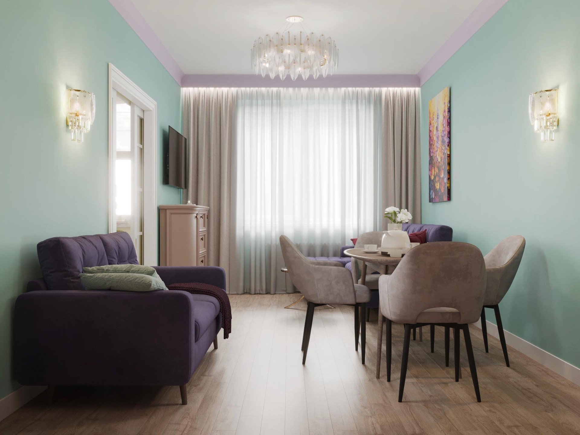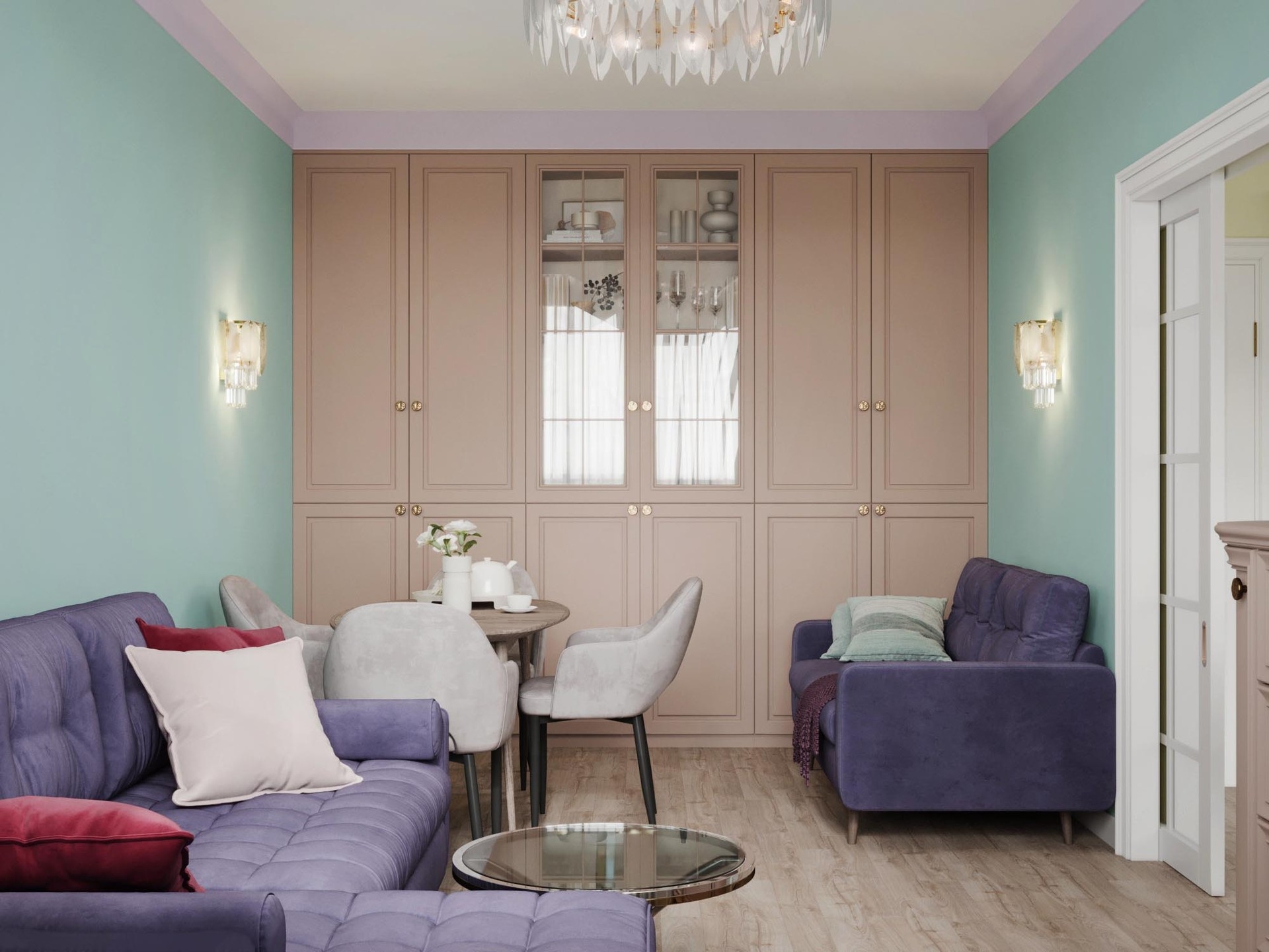 При разработке концепции дизайна квартиры брали картины с яркими красками и плавно переносили их в каждое помещение. Постарались увеличить пространство в каждой комнате за счет зеркальных вставок на полотнах межкомнатных дверей,а фрески в спальне и прихожей переносят в атмоферу вечного лета.