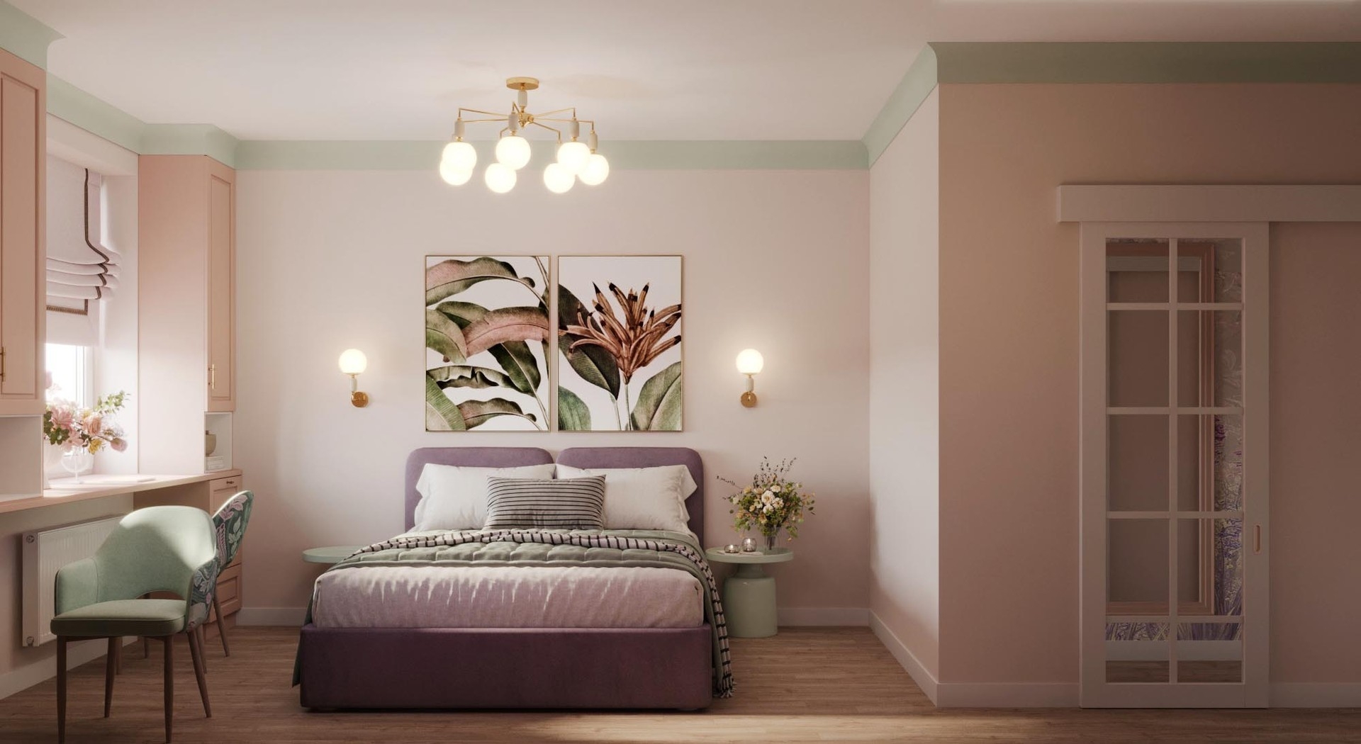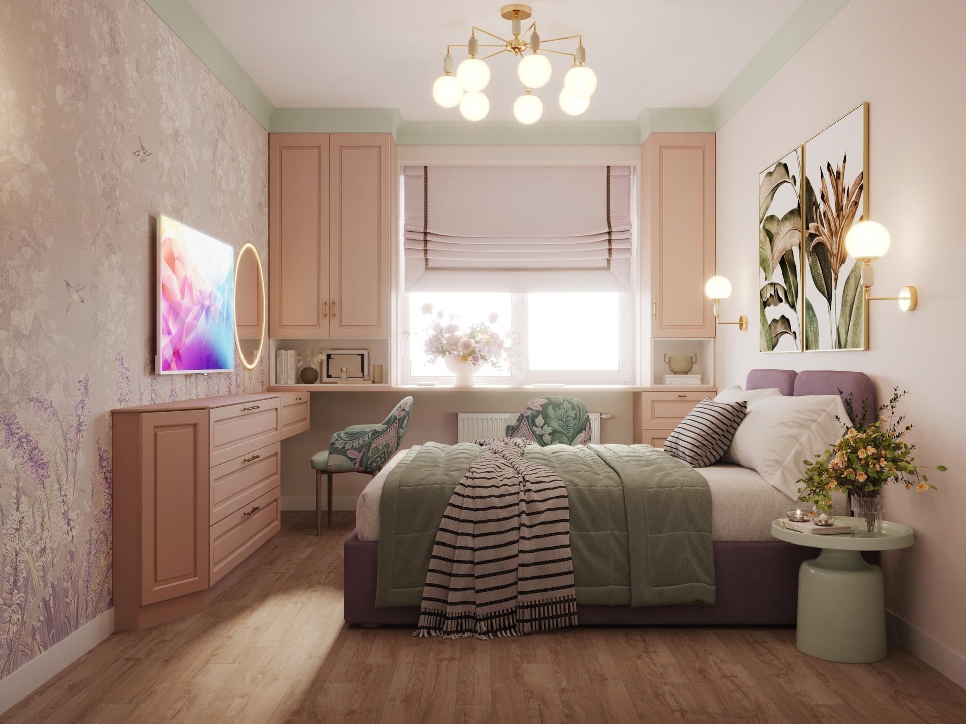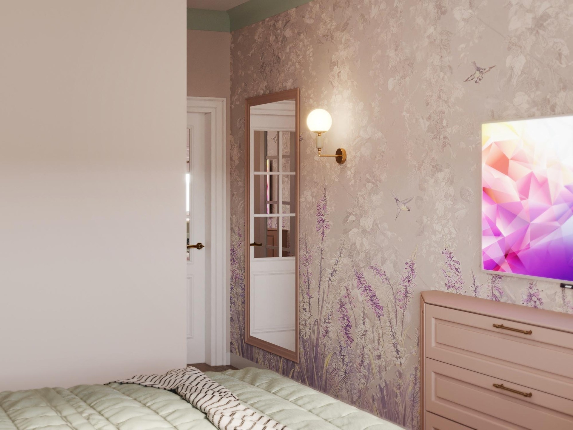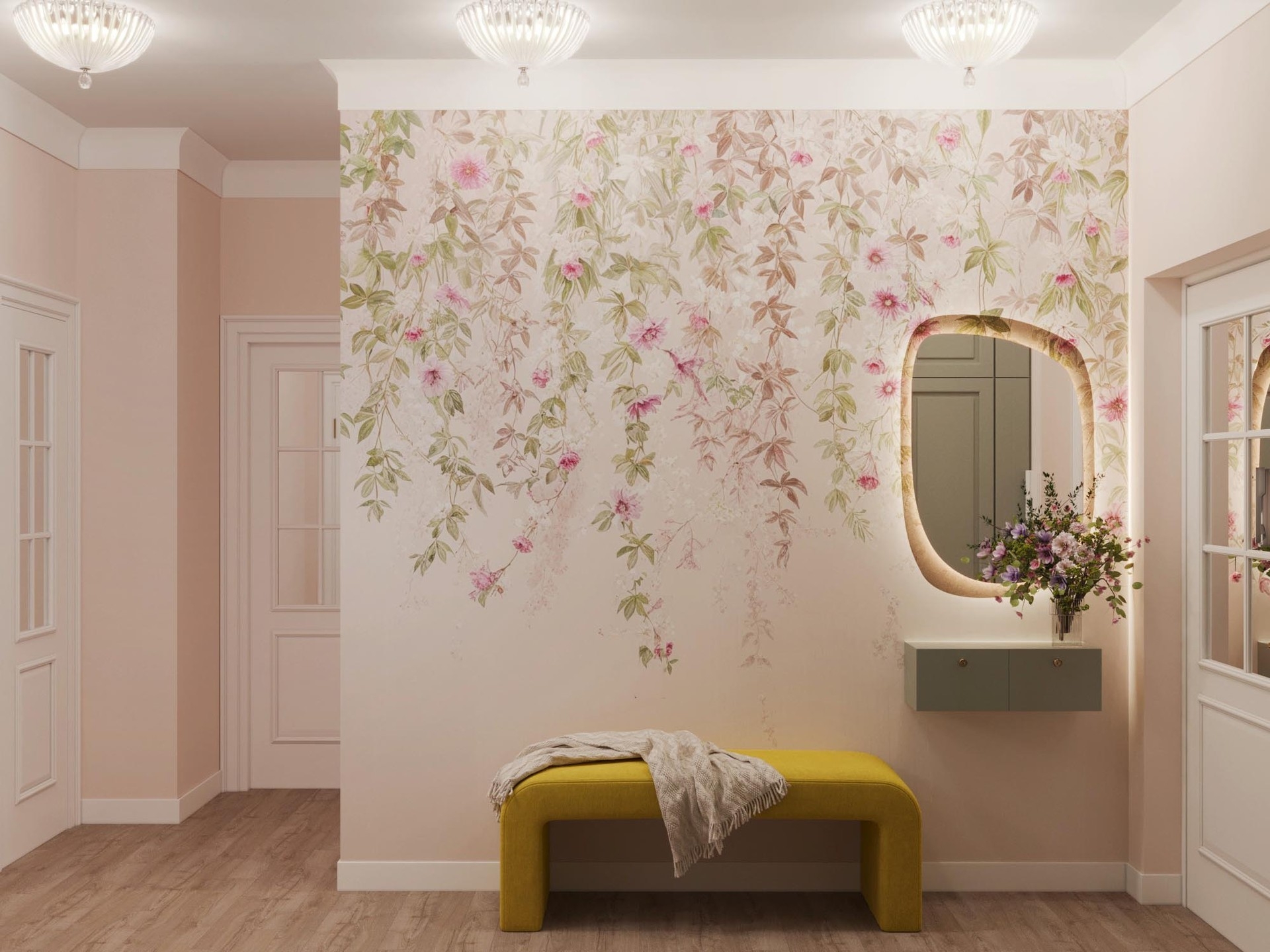 При разработке концепции дизайна квартиры брали картины с яркими красками и плавно переносили их в каждое помещение. Постарались увеличить пространство в каждой комнате за счет зеркальных вставок на полотнах межкомнатных дверей,а фрески в спальне и прихожей переносят в атмоферу вечного лета.