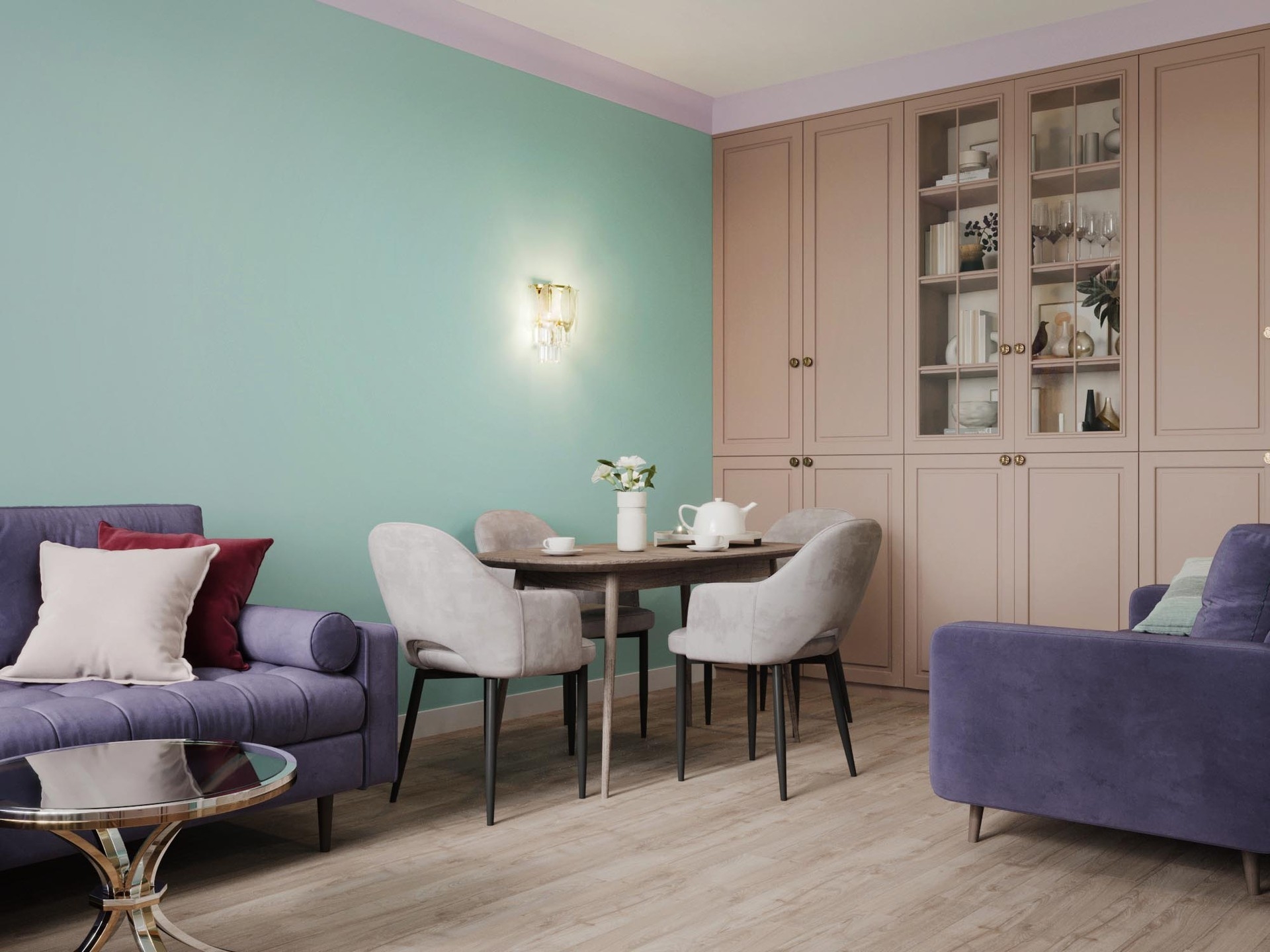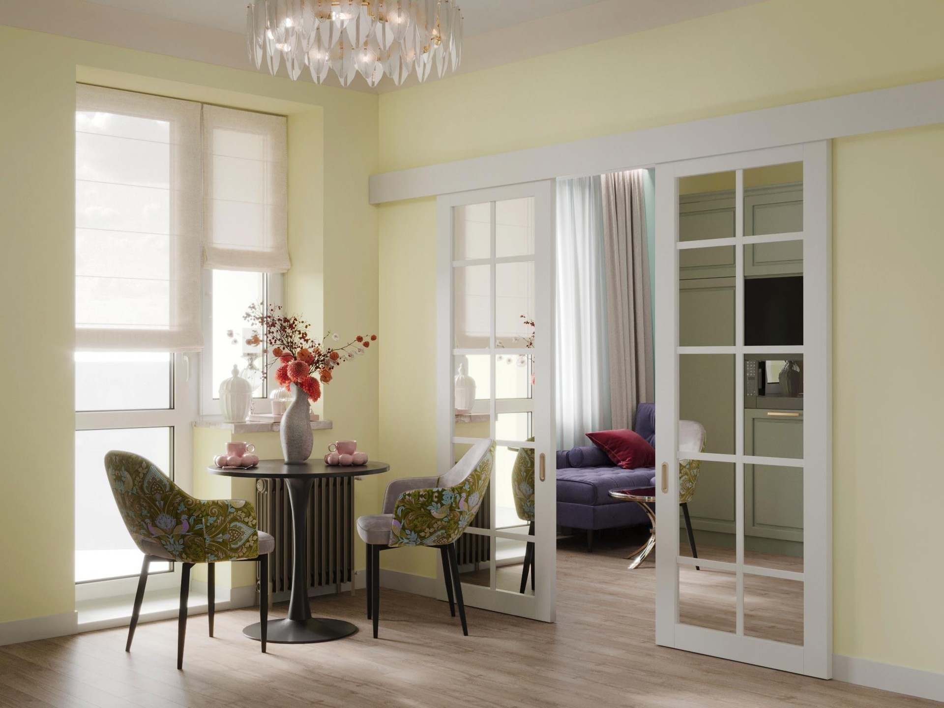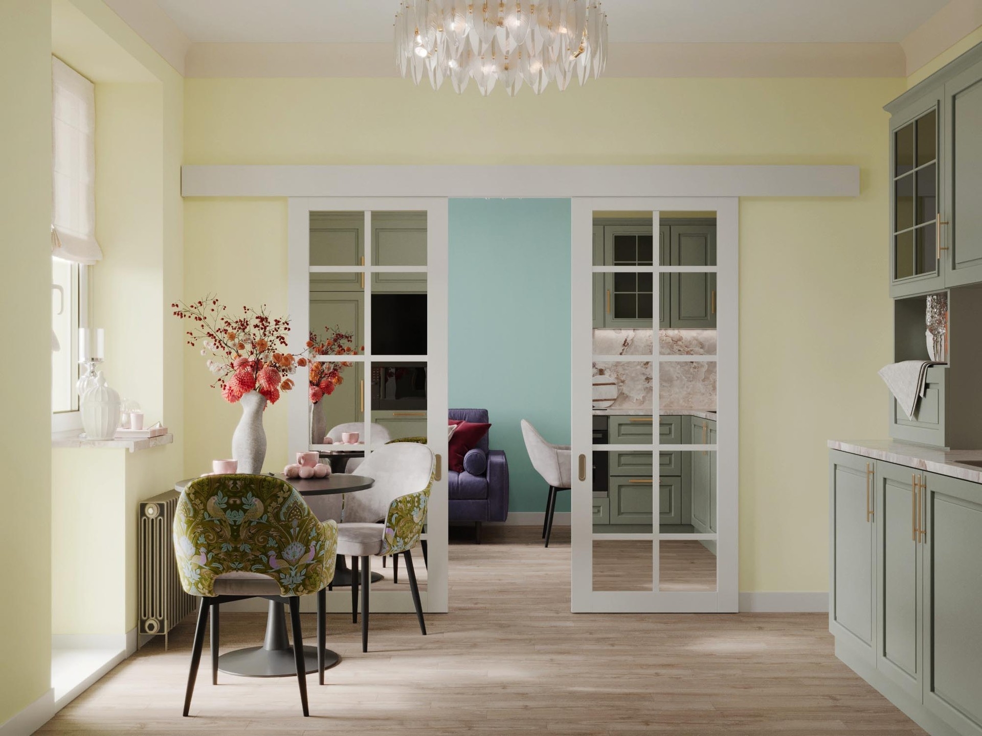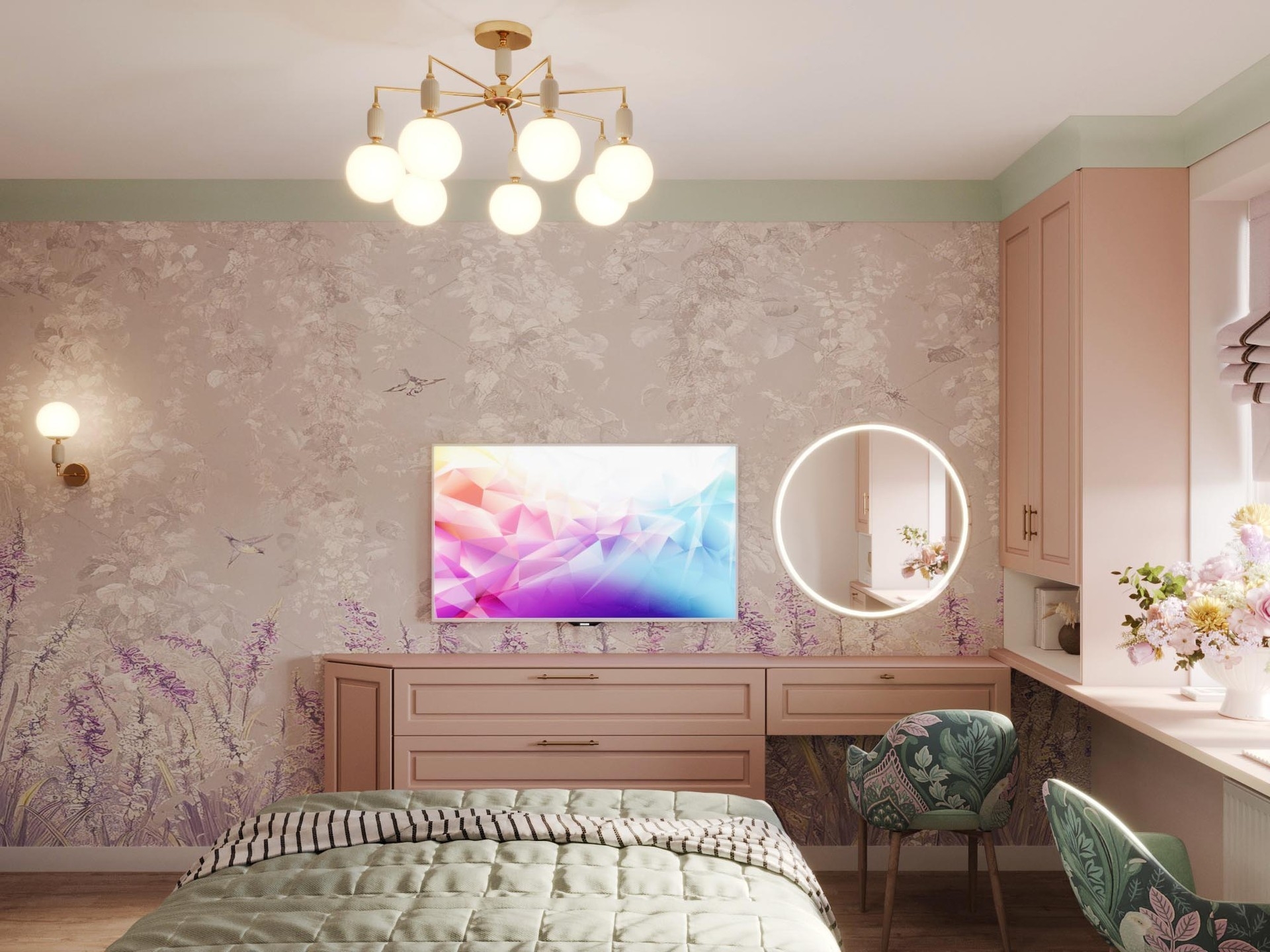 При разработке концепции дизайна квартиры брали картины с яркими красками и плавно переносили их в каждое помещение. Постарались увеличить пространство в каждой комнате за счет зеркальных вставок на полотнах межкомнатных дверей,а фрески в спальне и прихожей переносят в атмоферу вечного лета.